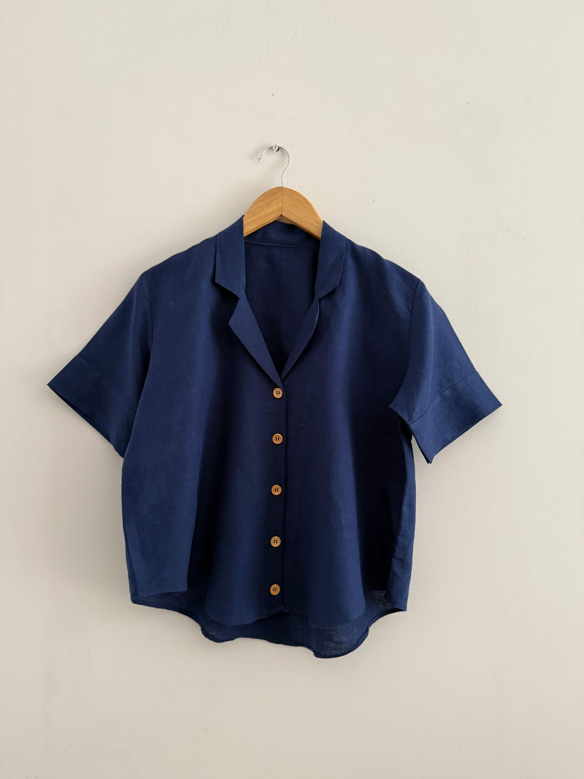 An easygoing essential for slow mornings and sunlit afternoons. Crafted from breathable, lightweight linen, this indigo short-sleeve button-up is relaxed in all the right ways. Featuring a soft notched collar, gently dropped shoulders, and natural wood-look buttons, it’s perfect for lounging, layering, or stepping out. The curved hem adds a flattering flow to its boxy silhouette, making it as versatile as it is comfortable.