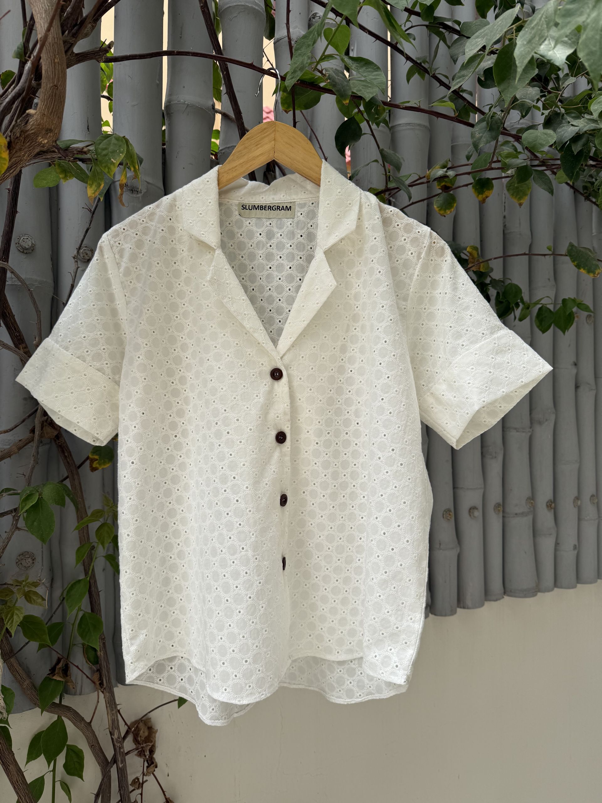 Step into breezy elegance with our West Eyelet Shirt – a short-sleeved, relaxed button-down crafted in soft, breathable cotton with delicate eyelet embroidery. Featuring a notched collar, curved hem, and contrast dark buttons, this piece brings a subtle nod to vintage charm while staying effortlessly modern.